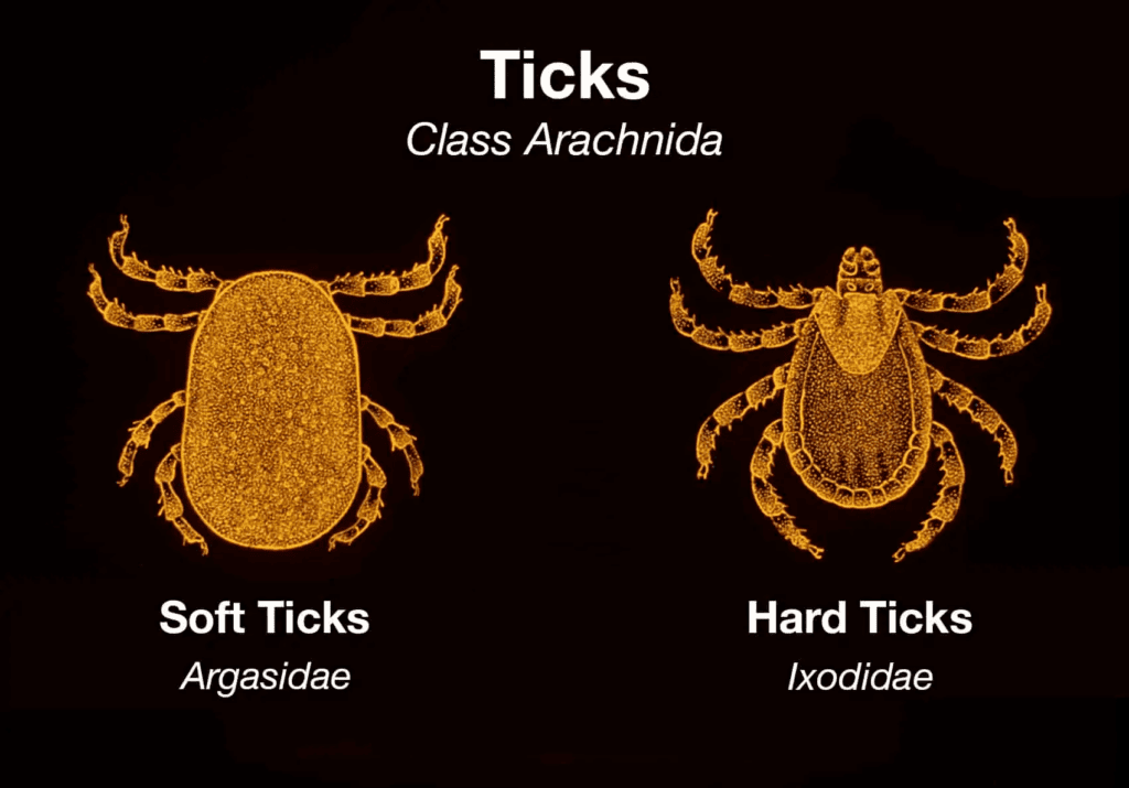 In general, ticks can be divided into two main families: hard ticks (Ixodidae) and soft ticks (Argasidae).