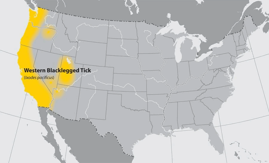 Western blacklegged ticks are located along the Pacific Coast, particularly in Northern California. But they have also been found inland to eastern Oregon, western Utah, and Arizona.